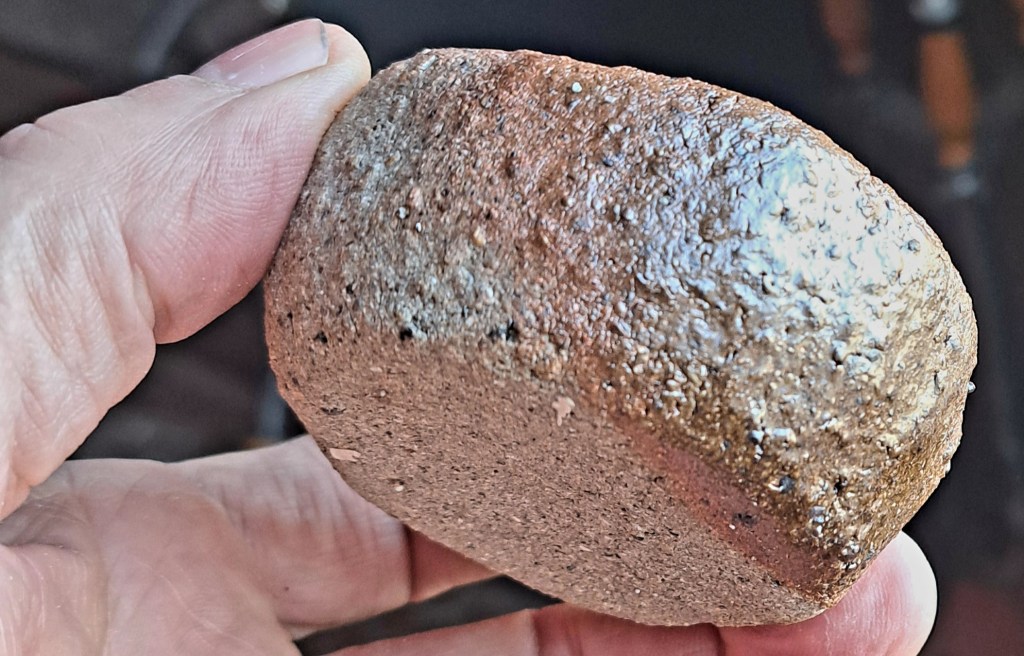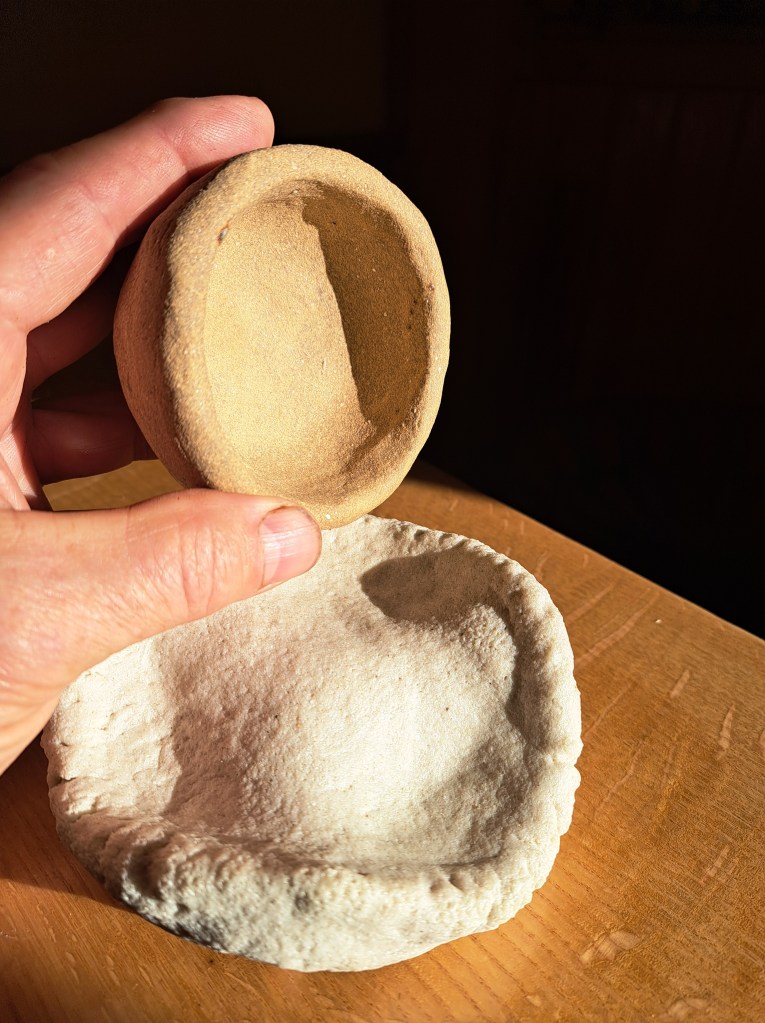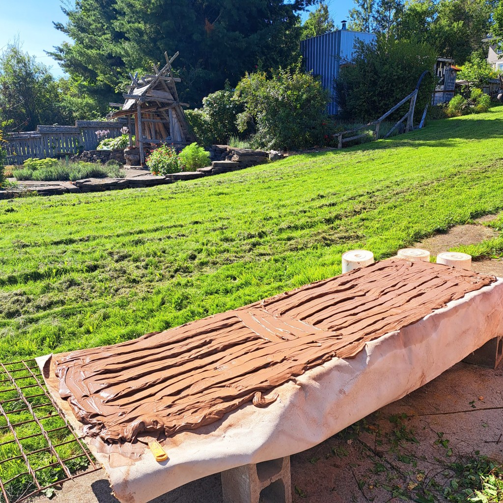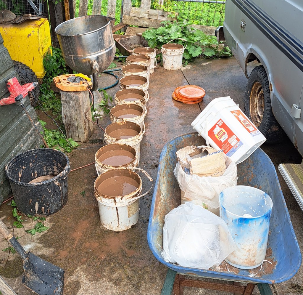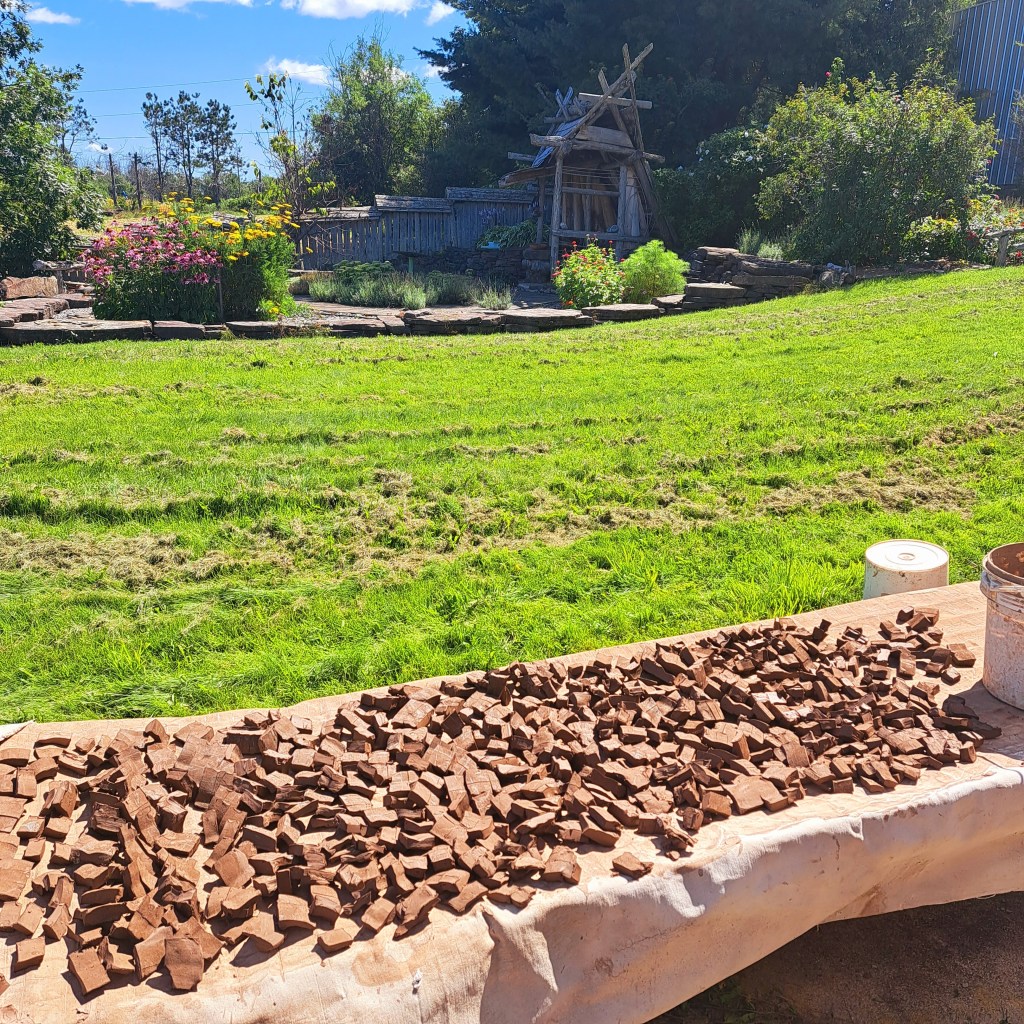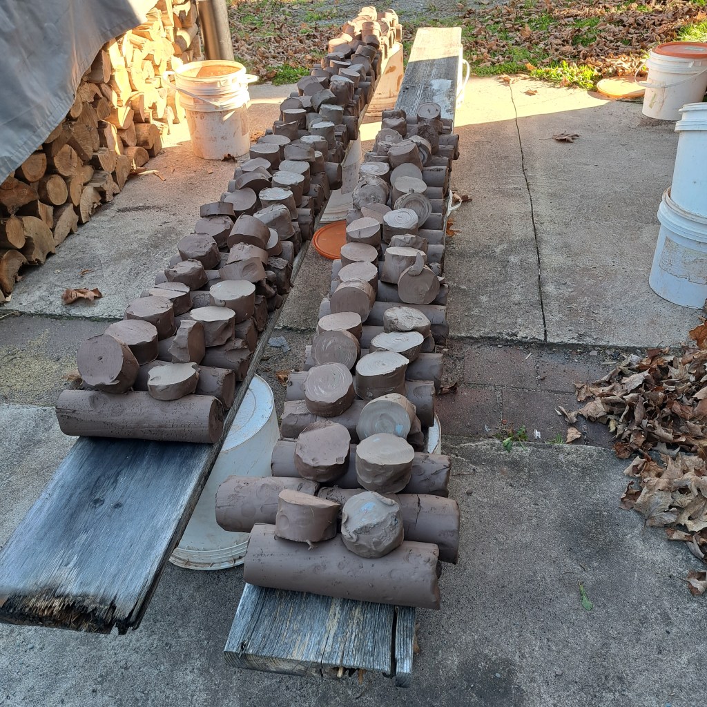 2022 amendment cookies arranged over raw Fundy Mud pugs before the final mix. Here adding 2 extra dug clays, one from the NS end of the Bay, the other is Keswick Mud, plus another potters cone 05 and cone 6 recycle scrap for the environment. I’ll add kyanite grog when I pug this into jam buckets for storage. About 500 lbs here, more than I’ll use this season. Some will be given away.