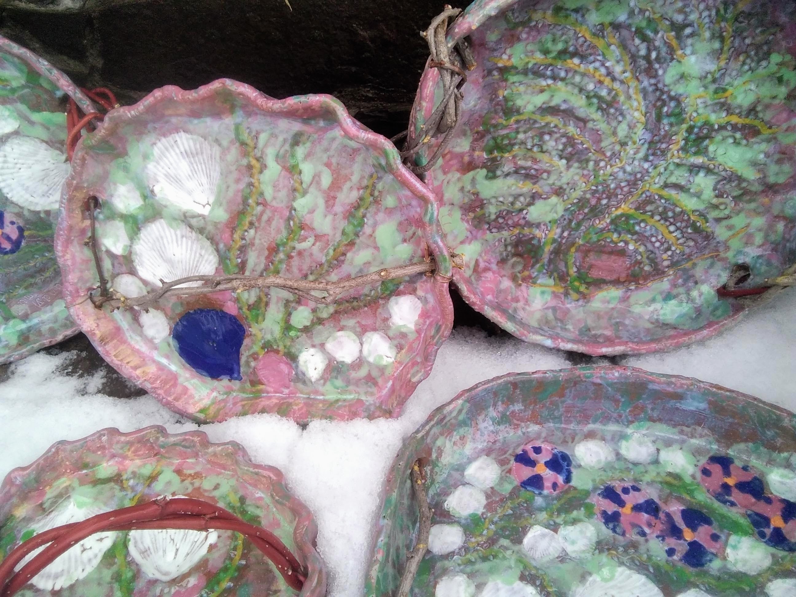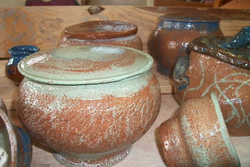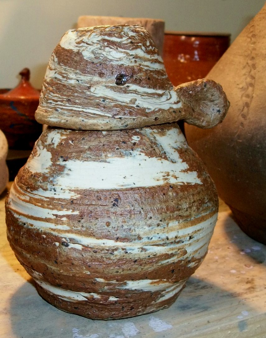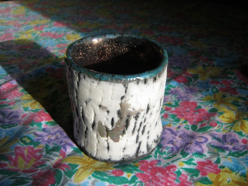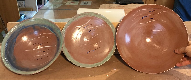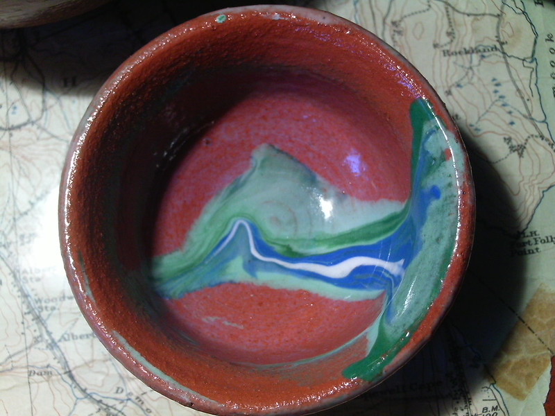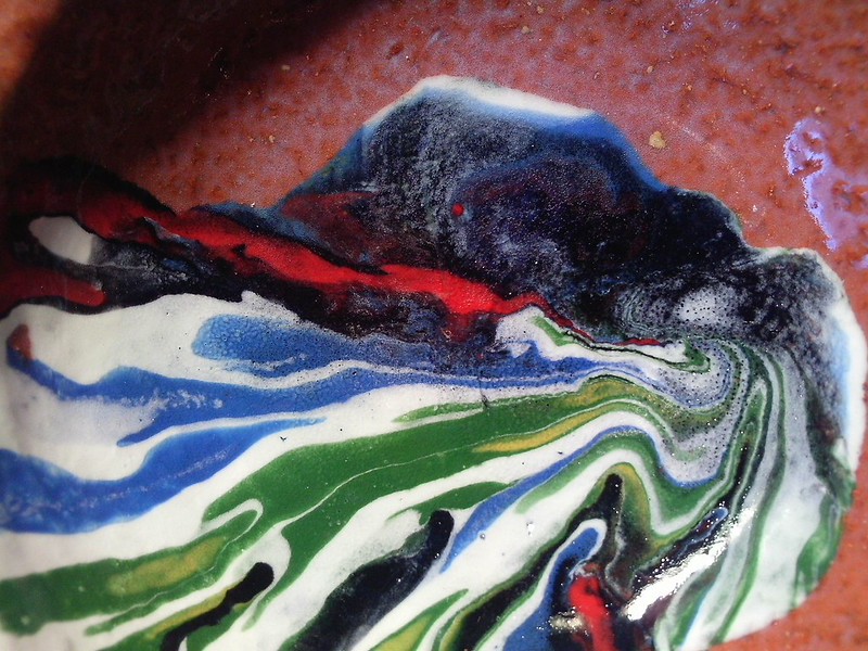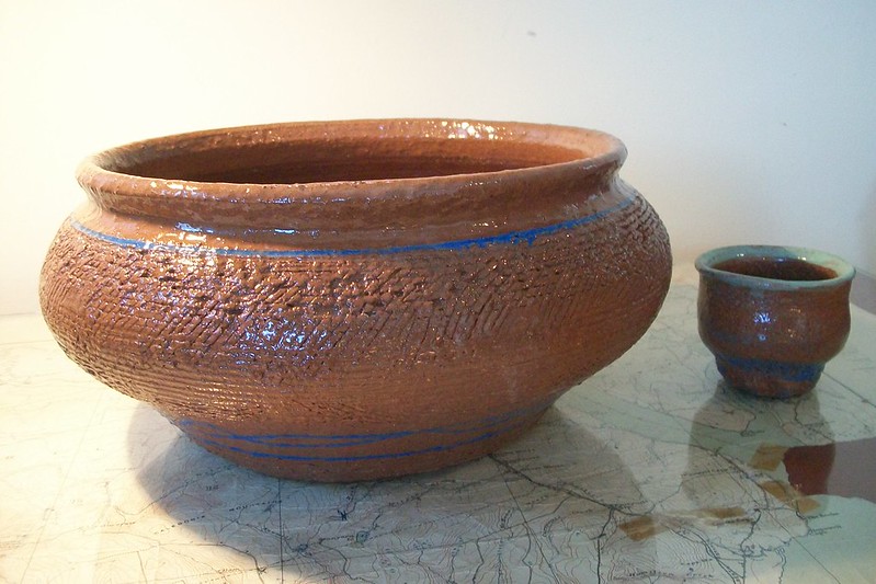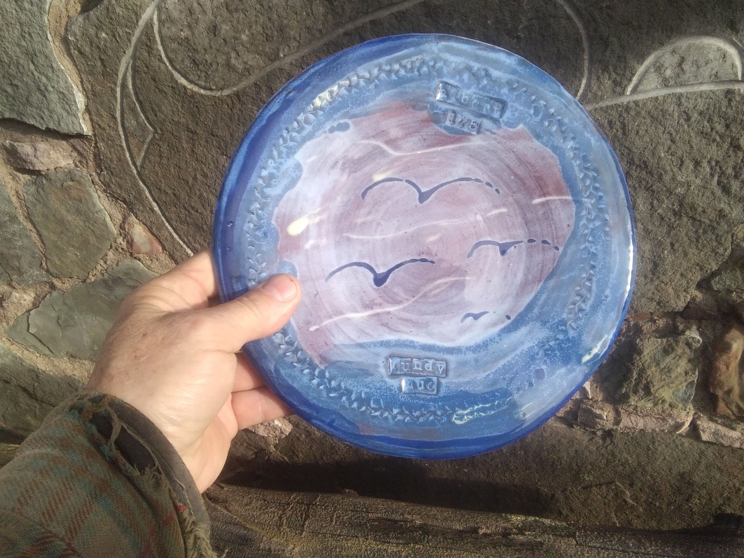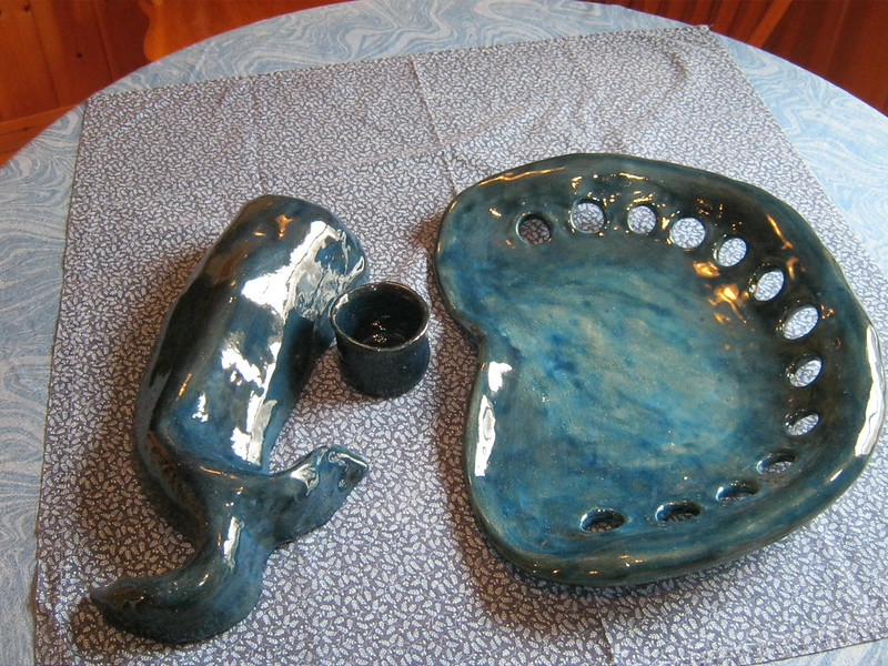 often do those bird shapes using white slip and a fan brush. 3 or 4 strokes in that one. Milk and cookies in one of my rare mugs. I don’t like to do handles, prefer tea bowls.gas fired pots, heavy melting on the left, textured as a ‘pollywog pot.’ Sitting on an early limestone and stick table. All my big iron ones are gone.commemorative Albert County plate first mud gathering spotcast, then slumped melted window glass ray fish, showing jade technique. I started my ceramic journey making glass molds