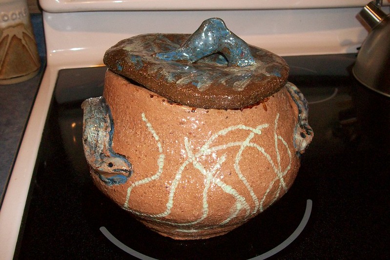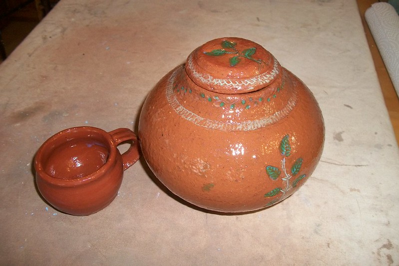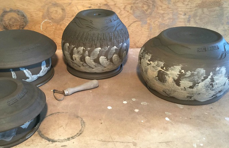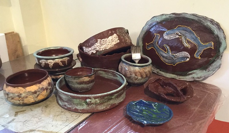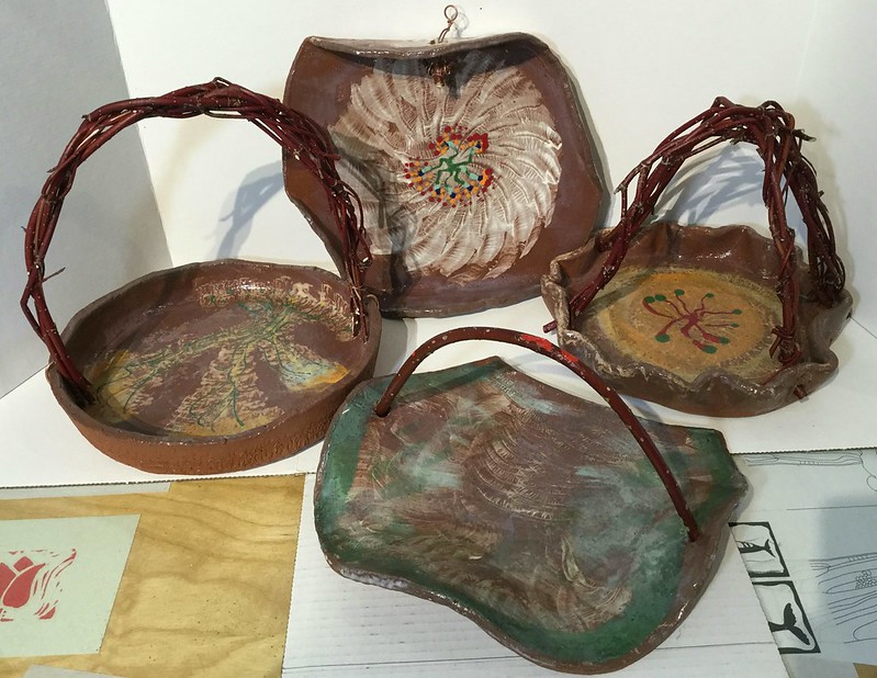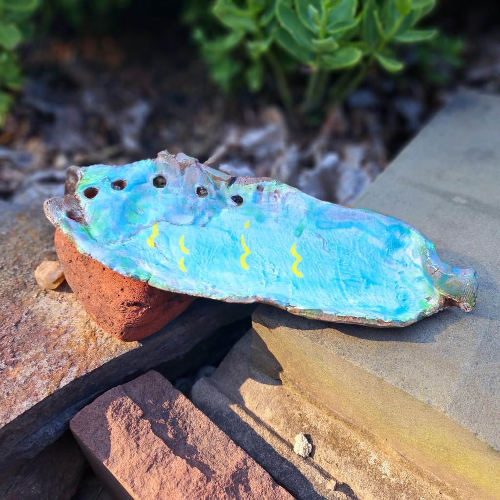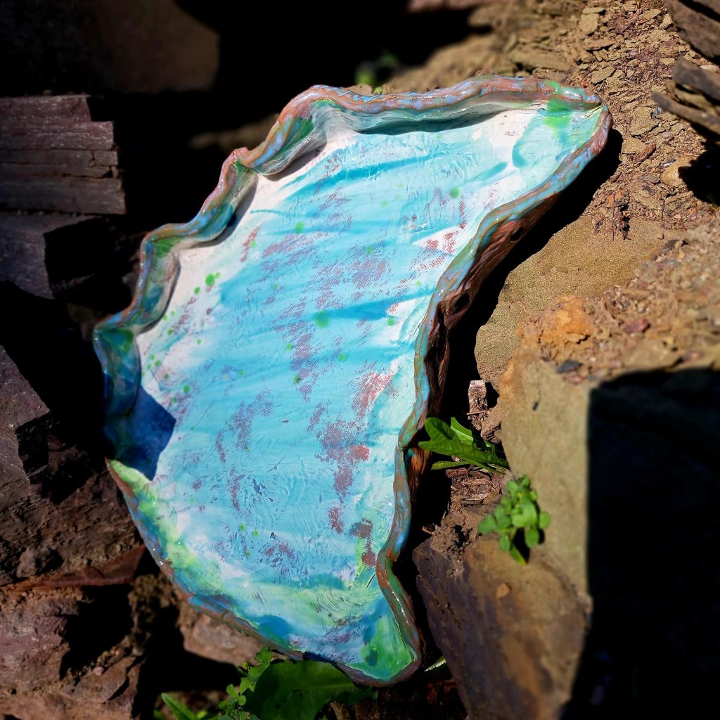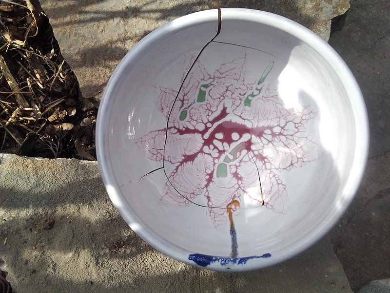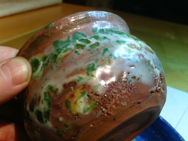 often do those bird shapes using white slip and a fan brush. 3 or 4 strokes in that one. Milk and cookies in one of my rare mugs. I don’t like to do handles, prefer tea bowls.gas fired pots, heavy melting on the left, textured as a ‘pollywog pot.’ Sitting on an early limestone and stick table. All my big iron ones are gone.commemorative Albert County plate first mud gathering spotcast, then slumped melted window glass ray fish, showing jade technique. I started my ceramic journey making glass molds