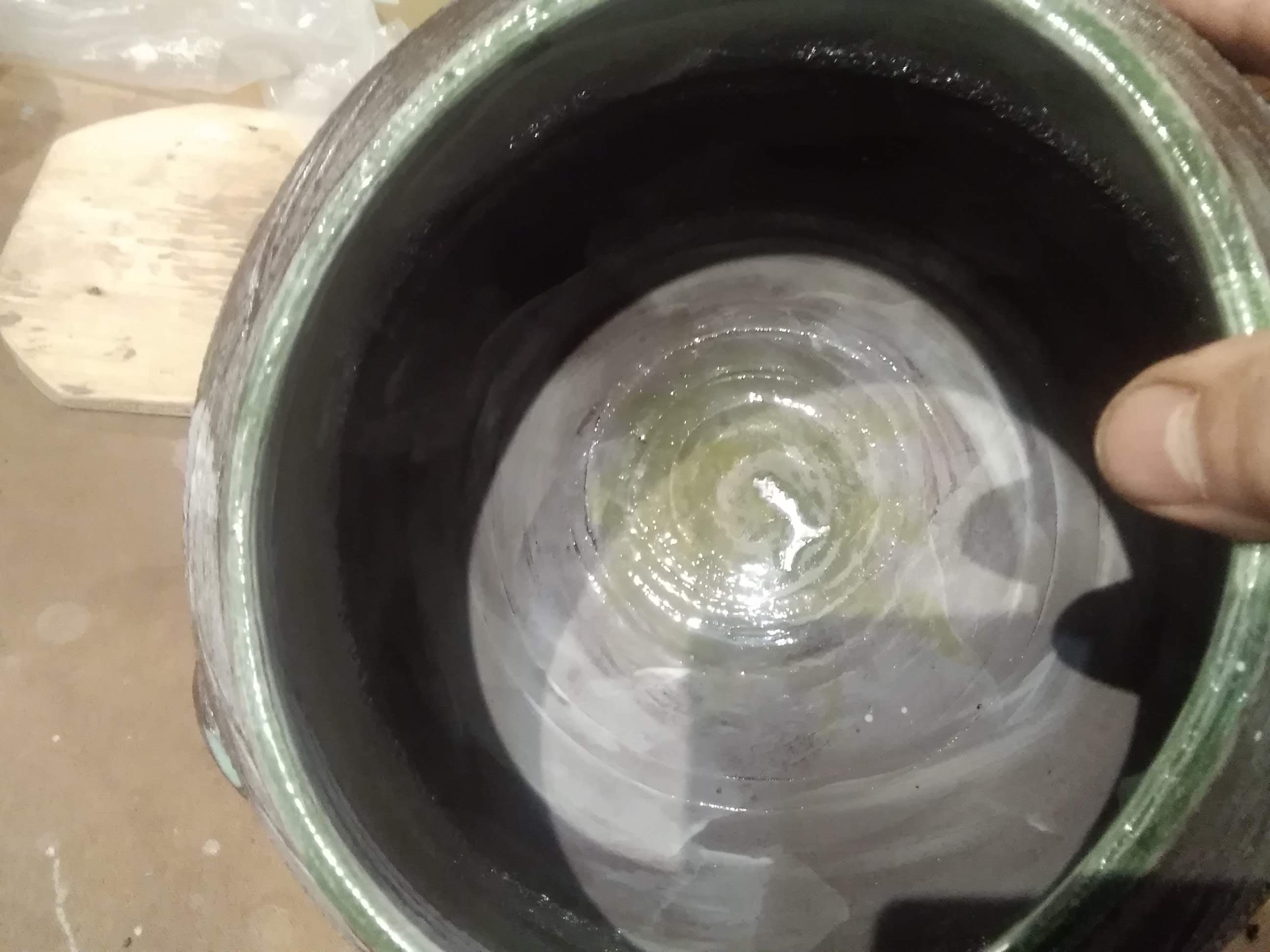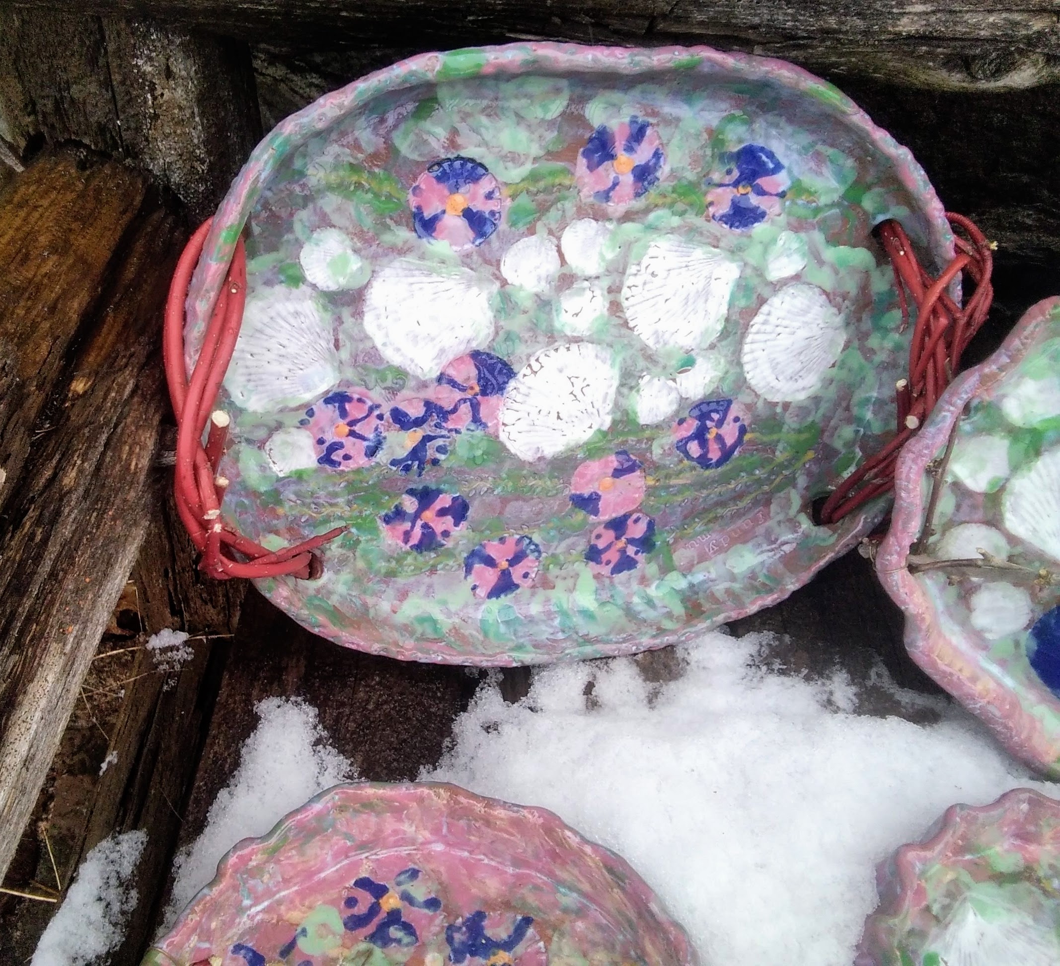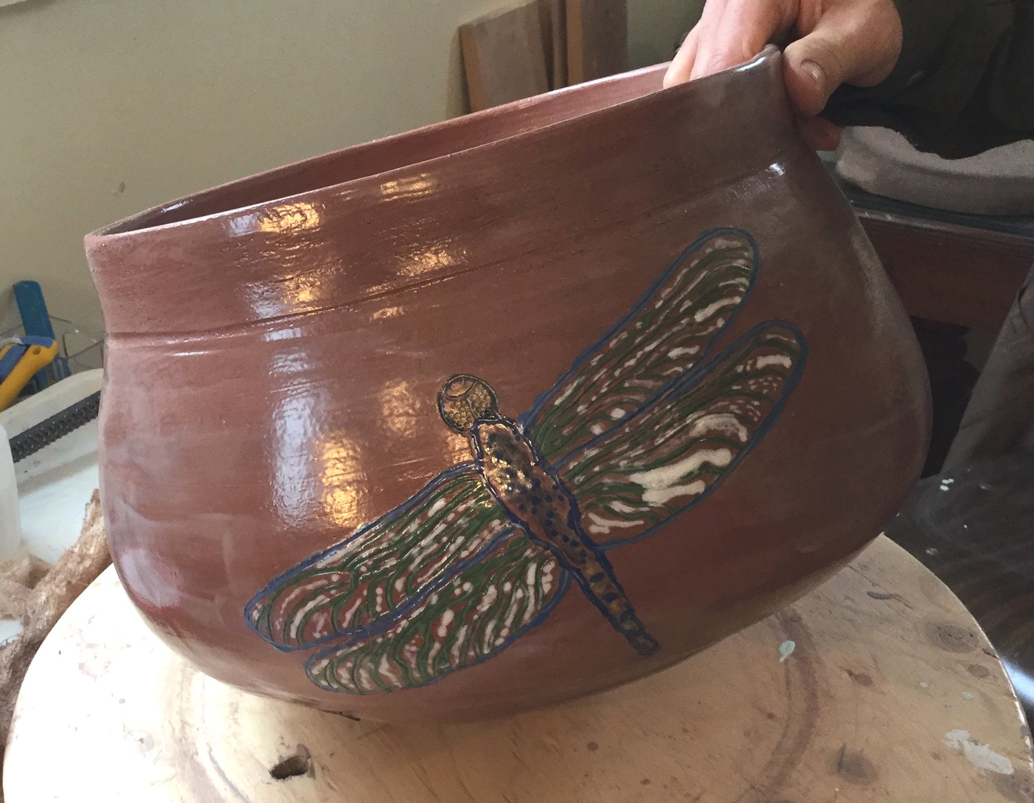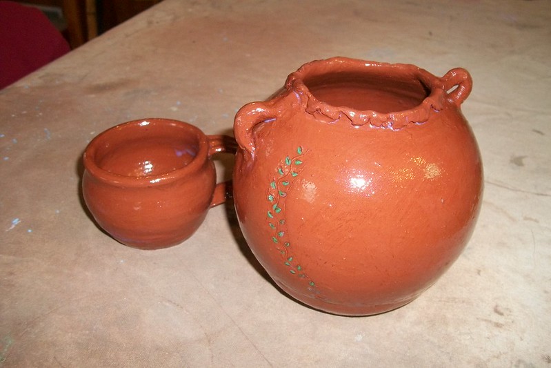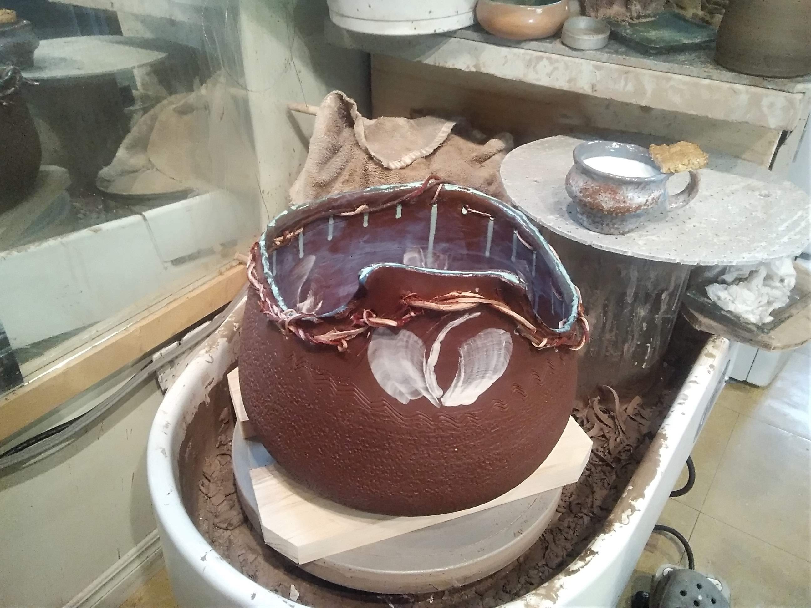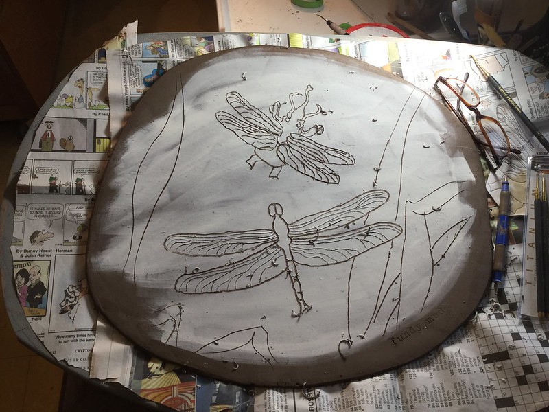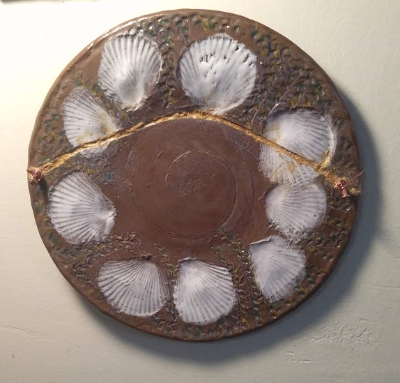 often do those bird shapes using white slip and a fan brush. 3 or 4 strokes in that one. Milk and cookies in one of my rare mugs. I don’t like to do handles, prefer tea bowls.gas fired pots, heavy melting on the left, textured as a ‘pollywog pot.’ Sitting on an early limestone and stick table. All my big iron ones are gone.commemorative Albert County plate first mud gathering spotcast, then slumped melted window glass ray fish, showing jade technique. I started my ceramic journey making glass molds