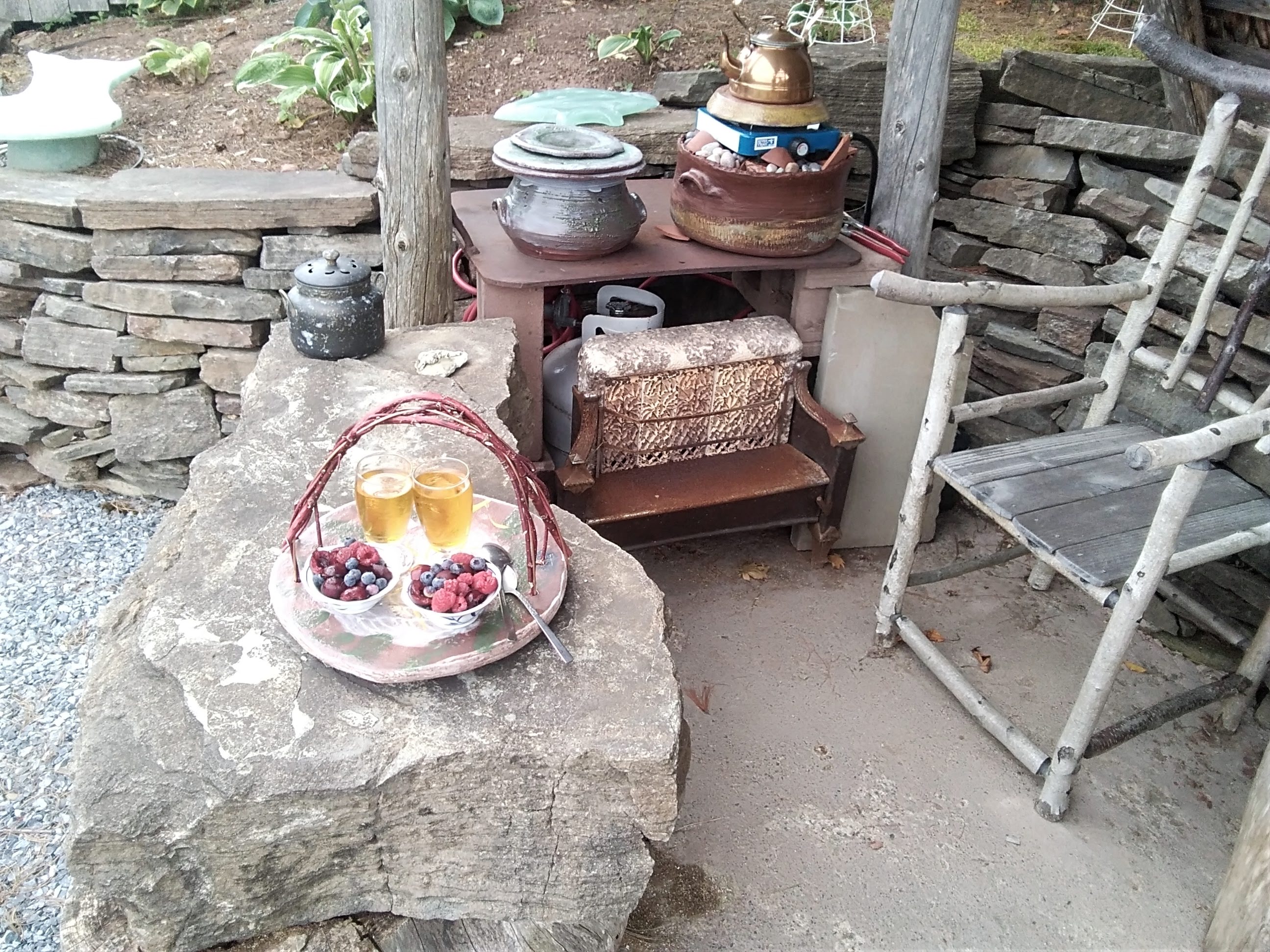 Obvara firing at Tim’s with ceramics class. I’m playing Shakuhachi kiln side, in wonder.