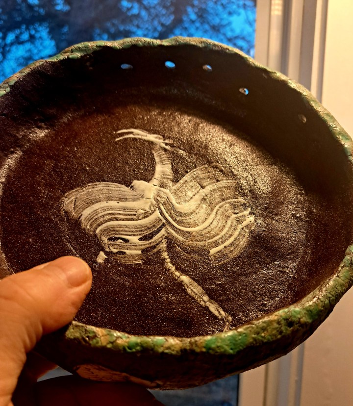 There Be Dragons… first little work in my ‘homeless’ phase after I dispersed my studio to the wind. Bisque at Judy Tait, cone 6 at Moon Woo. Hand building off the axe grindstone wheel in the closet, with my left over onggi tools. Looking like a series natural fibre collaboration. A Fundy Mud dug clay earthenware, doped up with Micheal Wood cone 6 reclaim fired to to a melt.